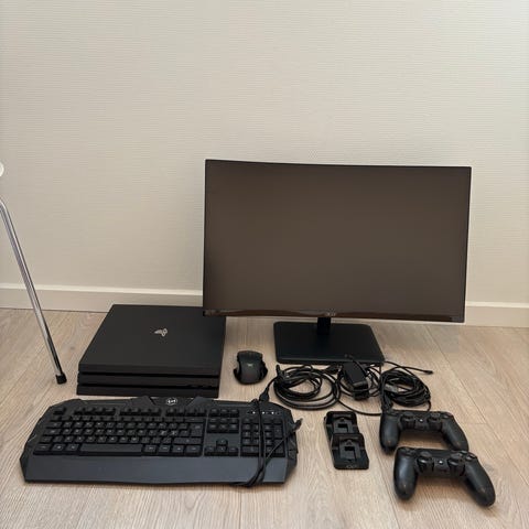 Sony PlayStation 4 Pro konsol i sort. Konsollen er en stationær spillekonsol fra Sonys PlayStation 4-serie. På billederne ses en DualShock 4-controller samt flere fysiske spil, som eventuelt kan indgå i sættet efter sælgers nærmere beskrivelse. Egnet til spil, streaming og underholdning i hjemmet med understøttelse af HDMI-tilslutning til tv eller skærm.