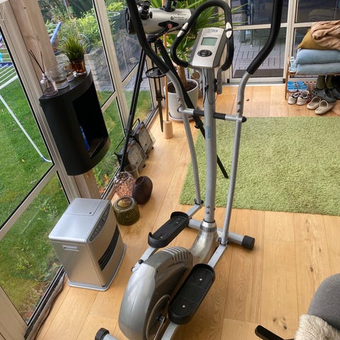Titan Fitness GO V450 crosstrainer i grå farve. Modellen har et elektronisk display med forskellige træningsprogrammer og knapper til styring af modstand og funktioner. Håndtagene er udformet til helkropstræning, og der er integreret holder foran. Egnet til indendørs konditionstræning og motionsbrug i hjemmet.