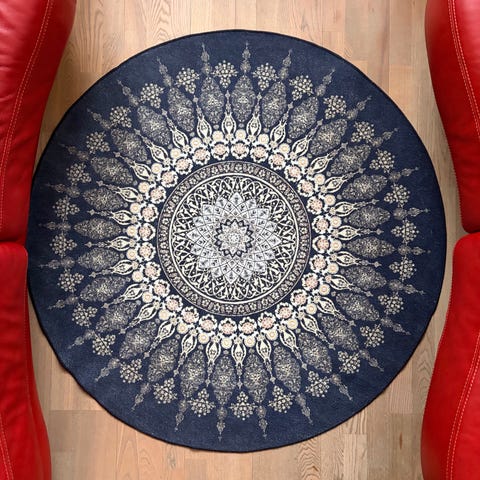 Ellos stort rundt tæppe i grå- og hvidmønstret design. Tæppet har et cirkulært mønster i koncentriske ringe og egner sig til brug i fx stue, soveværelse eller entré. Passer godt på trægulv og andre glatte underlag.