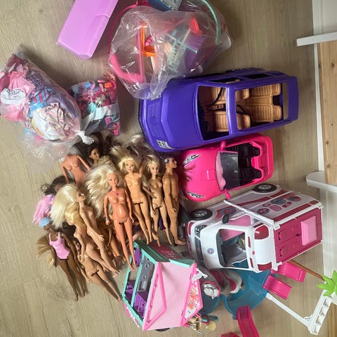 Barbie dukker og tilbehør sæt. Inkluderer flere Barbie dukker, Chelsea dukker og kæledyr samt forskelligt tilbehør som tøj, sko, tasker og små rekvisitter. Sættet omfatter også en stor pink campingbil/camper med køkken- og soveområde, en garderobe/kuffert med tøj på bøjler, en båd og en enhjørning samt havfrue. Der er også en ken figur. Næsten alle sættene er helt komplette med alle accessories. Der er 3 cutie reveal barbier. Sælges samlet. Egnet til leg med rollelege og opbygning af forskellige hverdagssituationer og fantasiverdener.