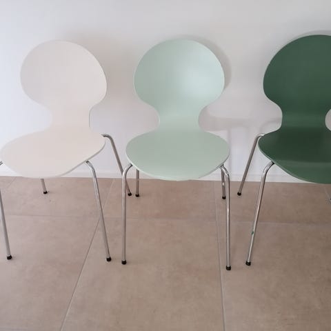 Hvid stol i plast, kan bruges indendørs og udendørs.