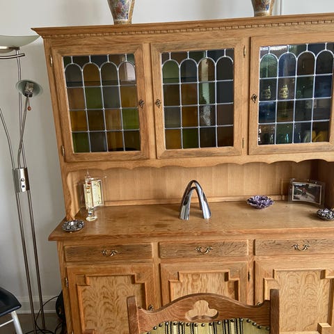 Møblet har en klassisk design med hylder, skabslåger og skuffer. Det er i lyst træ og glasfront.
