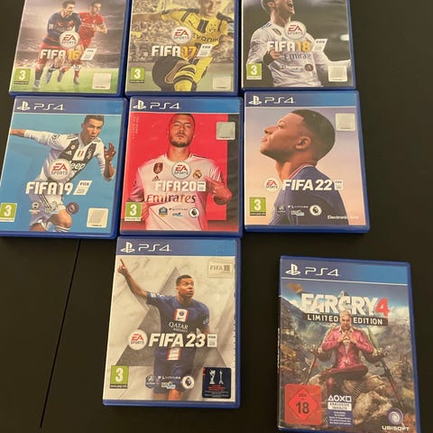 Playstation 4 spilsamling bestående af flere fysiske PS4-spil i originale blå plastcovers. På billedet ses blandt andet FIFA 18, FIFA 20, The Last of Us, Dishonored 2, Red Dead Redemption 2 og The Elder Scrolls Online samt yderligere et par titler. Spilene er på disk til Playstation 4-konsol og kræver kompatibel PS4 for afspilning. Velegnet til samling af forskellige genrer som sport, action og rollespil på Playstation 4.
