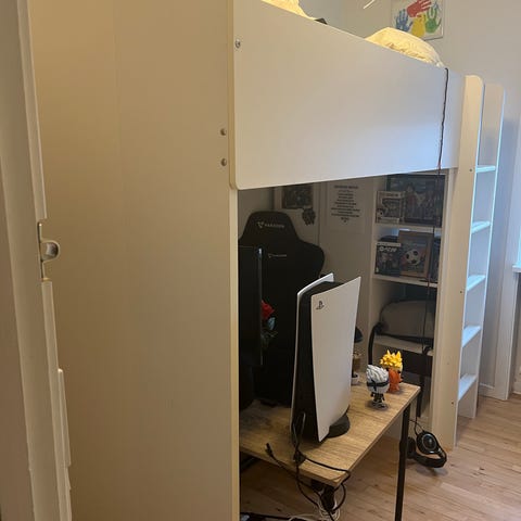 IKEA højseng i hvid af modellen småstad, men uden skuffe og bord. Sengen er hævet fra gulvet med indbygget stige på fronten. Under sengen er der åben plads, som kan anvendes til leg, skrivebord eller opbevaring. Konstruktionen er i træbaseret materiale med glatte, lyse overflader. Egnet til børneværelse, hvor der ønskes ekstra gulvplads under sovepladsen.