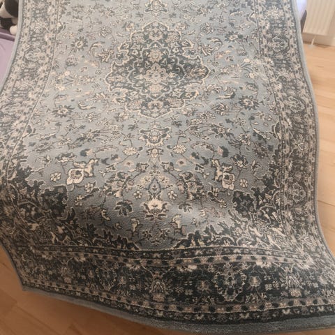 Tæppet har været brugt i ca. 1 år i et røgfrit hjem. Det har almindelige brugsspor, herunder: