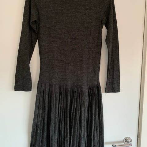 Gant hverdagskjole i uld i grå farve i størrelse S. Kjolen har lange ærmer og rund hals. Den er strikket i uld med mønsterbort i kontrastfarve foroven og forneden. Velegnet som varm hverdagskjole i køligere vejr.