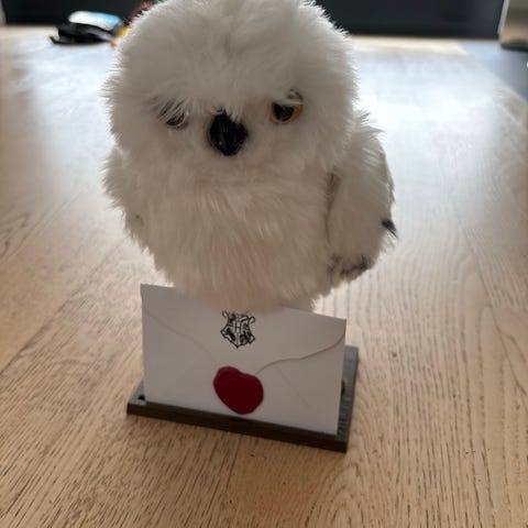 Harry Potter plysdyr ugle i hvid. Uglefiguren er fremstillet som et blødt plysdyr med gule øjne og sorte næbdetaljer. Den er monteret på en lille base og holder et brev med segl. Egnet som legetøj eller som dekorativ figur til fans af Harry Potter-universet.