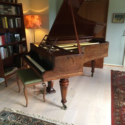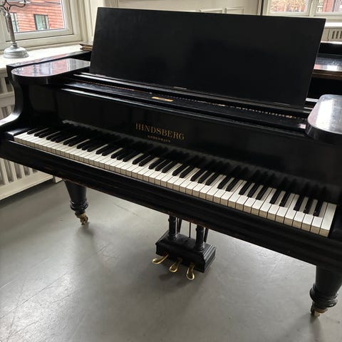 Klassisk akustisk flygel med fuldt klaviatur og traditionelt design med drejede ben. Egnet til brug i hjemmet, øvelokale eller mindre koncert- og undervisningsrum. Træoverfladen fremstår i mørk brun nuance med synlig årestruktur og detaljeret snedkerarbejde.