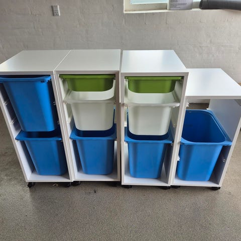 To stk trofast fra ikea sat sammen med en plade på toppen, som skrive bord. Vi har i og så sat ben på, for bedre højde.