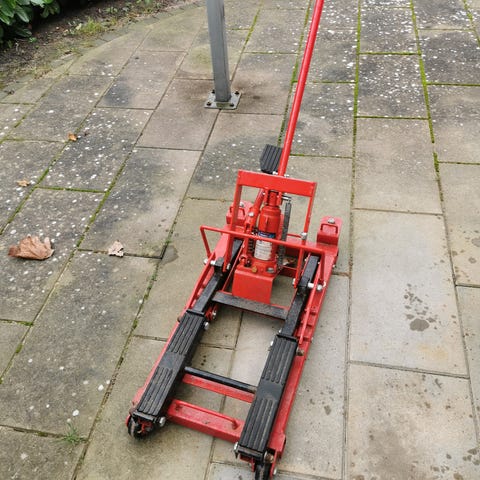 Motorcykel løfter i sort metal med skridsikre alu-plader på trædefladerne. Egnet til flyt/skub/manøvrering af motorcykler ved service og opbevaring i garage eller værksted.