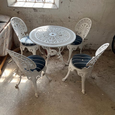 Smukt havesæt i hvidt jern. Kan bruges med hynder og parasol. Sælges pga flytning