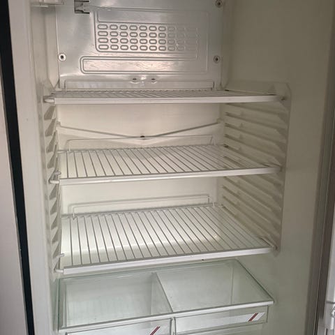 Matsui køleskab i hvid. Køleskabet har flere justerbare glashylder samt dørhylder til opbevaring af fx flasker og mindre varer. Indvendigt lys i toppen. Ydersiden viser synlige buler og mærker, og der er en synlig skade på en af hyldernes forkant. Velegnet som almindeligt køleskab i køkken, bryggers eller som ekstra opbevaringskøleskab. virker helt fint
