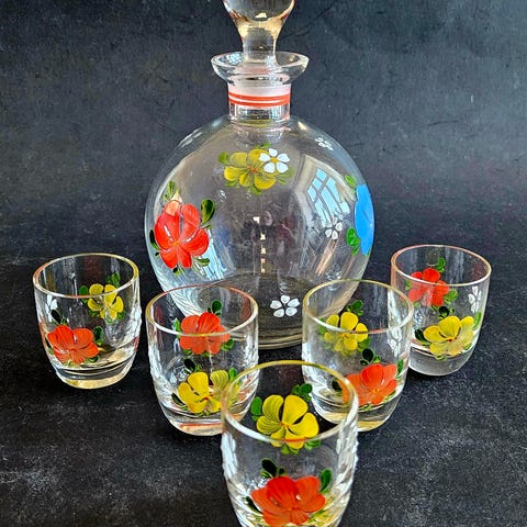 Karaffel i rødt glas med slebet, hvidlig dekoration på siderne og fronten. Karaffelen har rund prop i matchende rødt glas. Velegnet til opbevaring og servering af fx spiritus eller som dekorativ glasgenstand i indretningen.