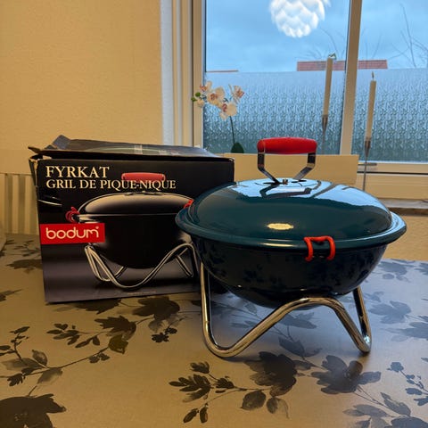 Bodum Fyrkat grillristeredskab i rund form i rød farve. Sættet består af en rød skål med tilhørende rist, velegnet til brug sammen med Fyrkat-grill eller lignende grilltyper. Egnet til tilberedning af mindre stykker kød, grøntsager eller andre grillretter. Leveres med original emballage som vist på billedet.