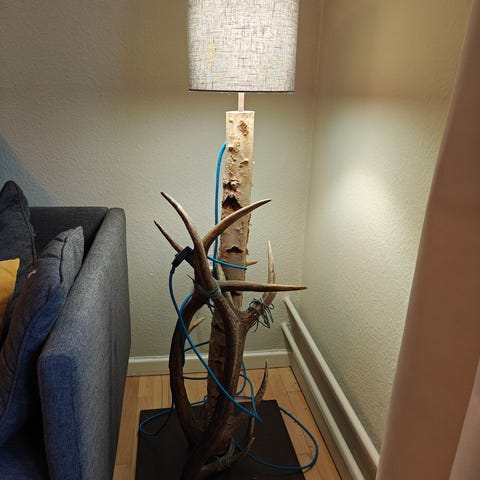 Hjemmelavet gulvlampe i birke træ, med en kerne og fod af jern. Stof skærm og grå ledning. Pærer medfølger.