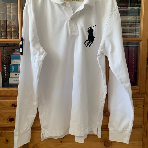 Ralph Lauren Polo herrepoloshirt i hvid bomuld i størrelse L. Klassisk polokrave med knaplukning og kort ærme. Broderet logo på brystet. Velegnet som hverdags- eller fritidstøj.