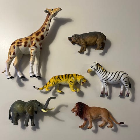 Plastik dyr, dyrene sælges samlet i de sæt de står i, men begge sæt kan selfølgelig købes sammen. 40kr pr sæt, begge sæt kan sælges sammen for 60kr.