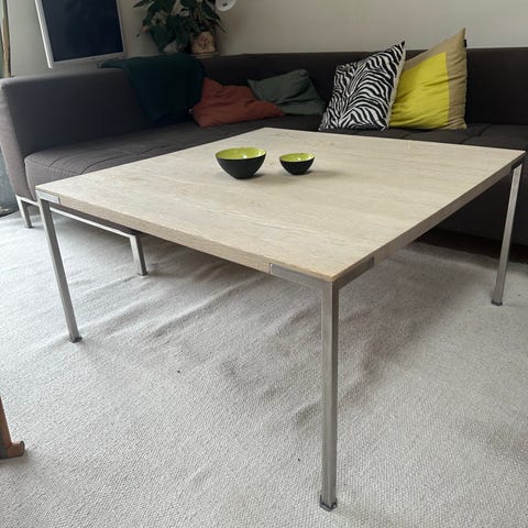 Flot og solidt sofabord i massivt træ med slanke ben i børstet stål. Enkelt, nordisk udtryk der passer godt til både moderne og klassisk indretning.