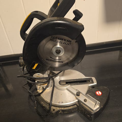 Manuel geringssav (mitre saw) med 550 mm klinge. Klassisk konstruktion i metal/støbejern, som man ikke ser på de helt billige nye modeller i dag.