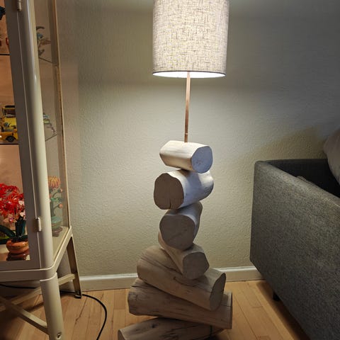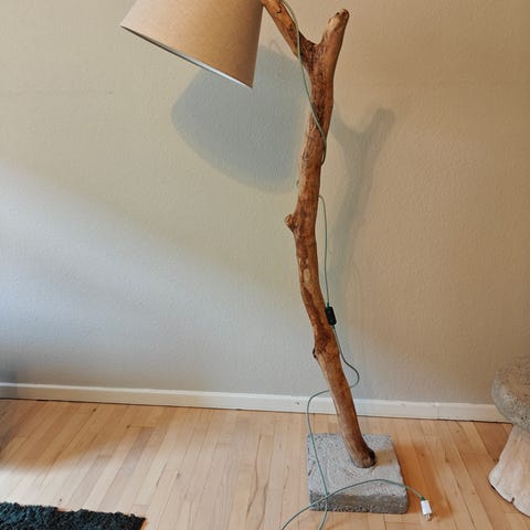 Hjemmelavet gulvlampe i birketræ. Med fod af en stor jern plade der måler 50 x 50 cm.