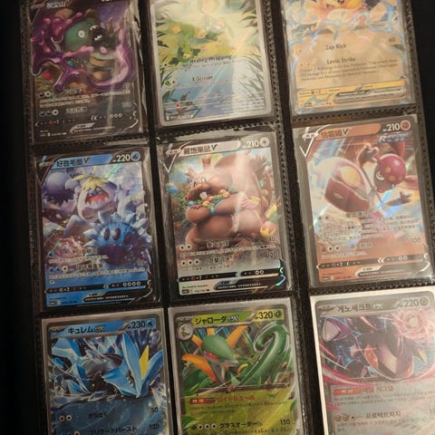 Pokémon samlekort mappe med blandede kort. Mappen indeholder forskellige Pokémon-kort i plastlommer, herunder flere holo- og full art-kort samt forskellige typer Pokémon og trænere. Flere sider med kort i forskellige sæt og motiver, egnet til samling eller udbygning af eksisterende samling.