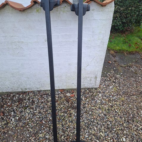Thule tagbøjler i aluminium med sorte fødder. Bøjlerne er udstyret med lås og nøgle, som ses på billederne. Systemet monteres på bilens tag via de viste fødder/beslag. Egnet som basis for montering af f.eks. tagbokse eller andet taglast-tilbehør, der passer til Thule tagbøjler. Nærmere mål og præcis biltilpasning fremgår ikke af billederne og bør kontrolleres via Thules kompatibilitetsguide eller mål på stedet.