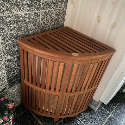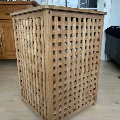 Vasketøjskurv i hvidmalet træ med lameller og hængslet låg. Indvendigt er der en aftagelig stofpose i lys farve.