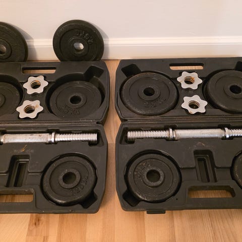Sælger et sæt justerbare håndvægte med vægtskiver og stænger. Perfekt til styrketræning derhjemme uden at fylde for meget. Du kan nemt justere vægten alt efter øvelse og niveau.