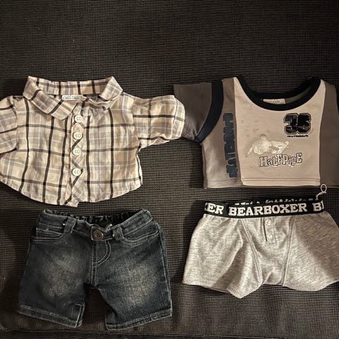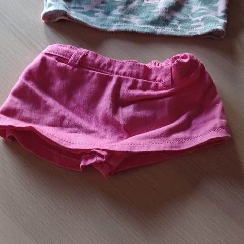 2 par shorts, 1 hættetrøje med camouflage, solbriller, Skechers sko hvid og blå.