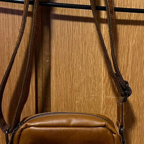 Cognacfarvet lædertaske. Kan bæres over skulderen eller man kan lyne remmen op og bruge den som rygsæk. Udvendig lomme med nøglering. Indvendig lynlåslomme.