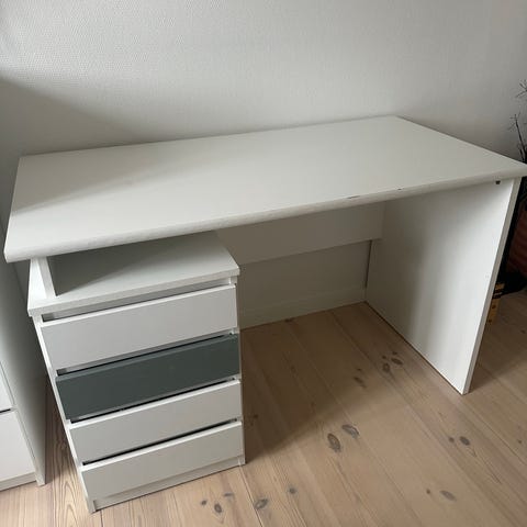 Hvidt skrivebord med tre skuffer til børneværelset. Lille og kompakt men med god opbevaringsplads.