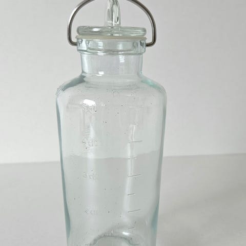 Beholderen er fremstillet i klart glas med metalbøjle og løst låg.