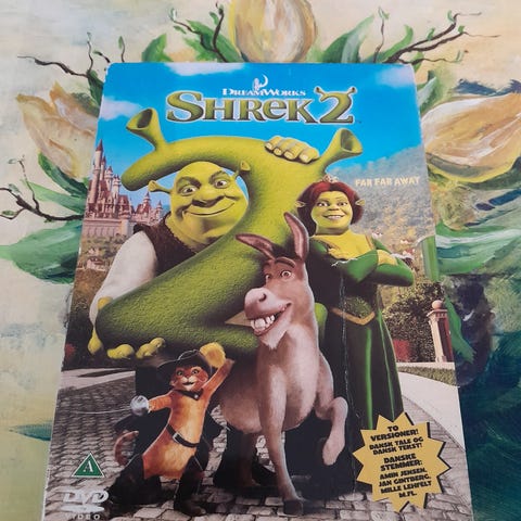 Shrek 2 dvd med originalt omslag. Filmen er en animeret familiefilm med kendte figurer fra Shrek-universet.