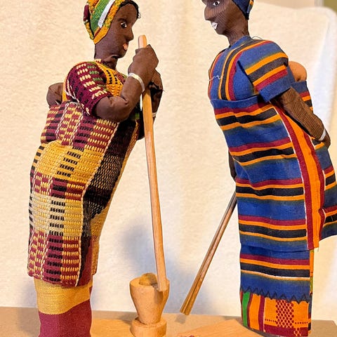 Tre farverige 64 cm store dukker lavet i stof med perler of metal (halskæder) købt i Namibia i begyndelsen af 1990'erne, men kan være produceret i Sydafrika. Dukkerne er som sagt 64 cm høje og måler 14-15 cm i diameter og sælges samlet for 425 kr., som betales kontant eller MobilePay ved afhentning fra adresse.