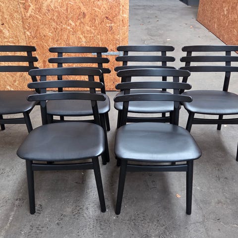 Stilrene og tidsløse spisebordsstole. Stolene er i massiv sortmalet egetræ og har et sæde i en lækker, slidstærk sort okselæder.