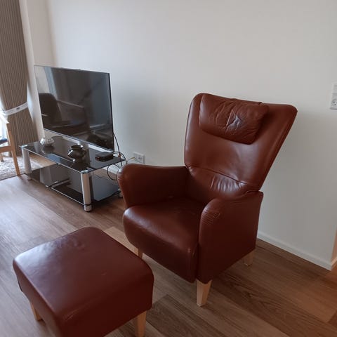 2 stk. Swedese Stepp kvalitets lænestol og skammel samt nakkepude - grågrønt luksus læder, aluminiums ben. Lænestolen har en yderst god komfort og et eksklusivt og elegant look. Nypris i dag samlet ca. kr. 32.000.