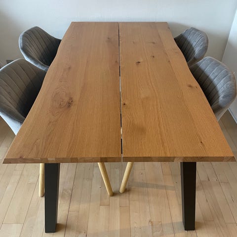 Helt nyt (4 mdr ) Spisebord SKOVLUNDE ( 90x160 natur Eg) Tillægsplade kan tilkøbes. Samt 4 helt nye (4mdr)JONSTRUP spisebordsstole i farven Cognac med ben i Eg med en utrolig siddecomfort sælges p.g.a flytning. Nypris: 5800 kr. sælges alt inkl.