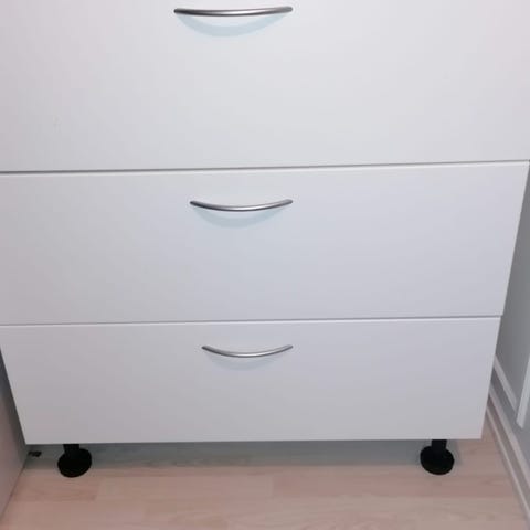 To hvide arkitektkommoder med fem skuffe i hver.