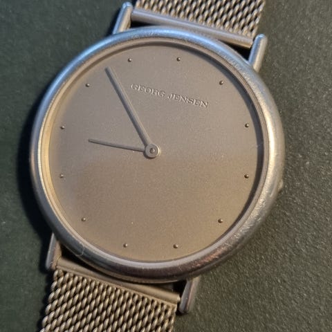 Urkasse i rustfrit stål med grå urskive og grå metalrem. Der kan medfølge ny original Georg Jensen sort læderrem efter aftale.