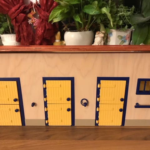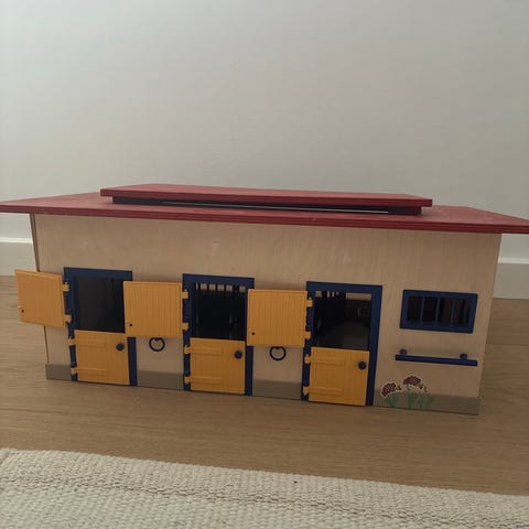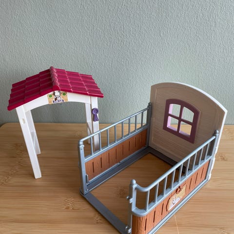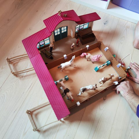 Hestestald til schleich-heste. Åbning i top, foran, bagerst og i siden. Plads til 3 heste. Træ og plast.