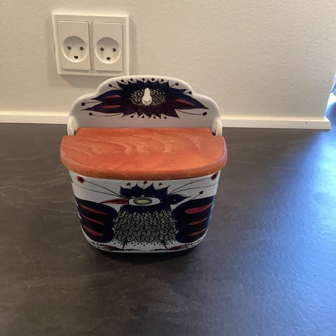 Aluminia saltkar væghængt grøn keramik med trælåg