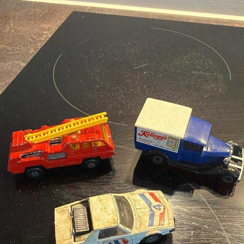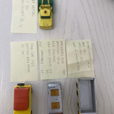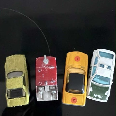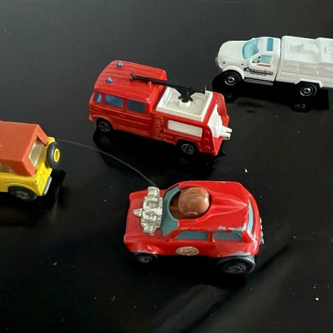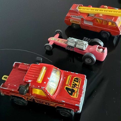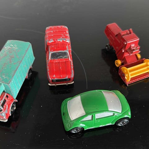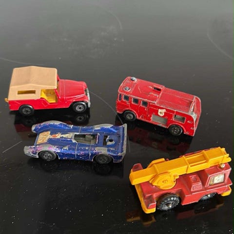 Matchbox små legetøjsbiler i metal. Sættet består af fire biler i forskellige modeller og farver, herunder bl.a. en rød personbil, en hvid racerbil og en grøn lastbil med kran. Bilernes underside er i metal med støbte detaljer. Egnet som legetøj eller til samling af små modelbiler.