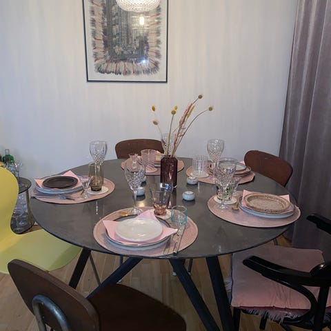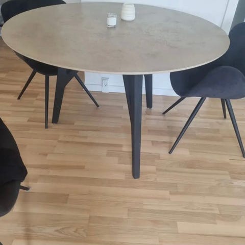Flot spisebord fra Fjord Interior. Bordpladen er udført i travertin (en form for natursten), som har fået en overfladebehandling.