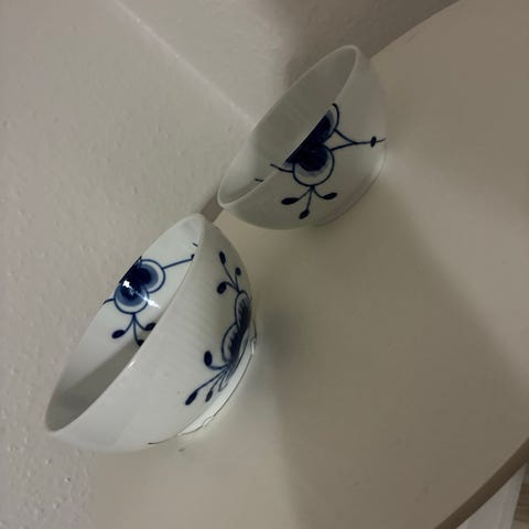 Royal Copenhagen Musselmalet Blå Mega Riflet serveringsskål på fod i porcelæn. Købt i december, men jeg har kun brugt den som dekoration i vinduet.