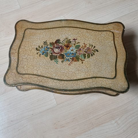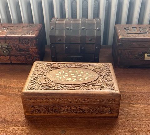 Trææsker, med fine udskæringer, mørk træ, 3 stk, passer ind i hinanden ligesom babushka dukker
