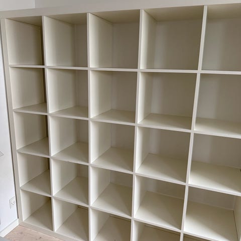 IKEA reol med kvadratiske rum i hvid. Reolen har flere ensartede åbne rum, velegnet til opbevaring af bøger, kasser eller dekoration. Nypris: 639 kr.