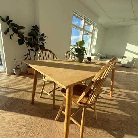 Spisebordet har nogle ringe fra glas. Vi har ikke behandlet det, men vi har noget olie og rens, som man kan få med gratis.