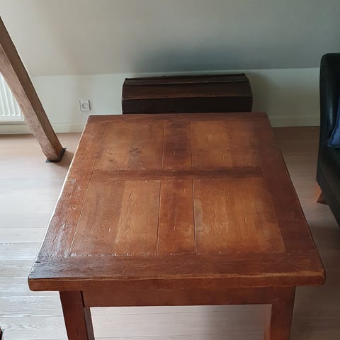 Fantastisk smukt og stort gammelt sofabord. Med skuffe under. Bordet er malet i en smuk grå farve og sort bordplade. Meget smuk patina. Bordet er købt i Provence i Frankrig.