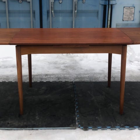 Flot sæt med spisebord i teak (130*90) med 2 udtræksplader a 53 cm, 4 stole med helt nyt betræk. Fra ca. 1970.