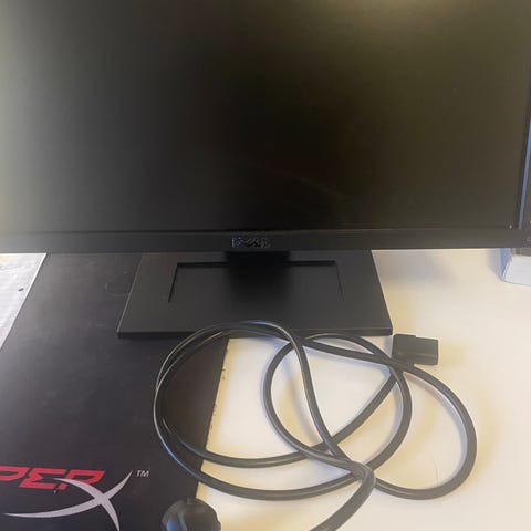 Dell skærm på 13 tommer i sort. Skærmen har rektangulært panel og står på en fod med fastmonteret stander. Der medfølger strømkabel og signalkabel som vist på billederne. Velegnet til brug sammen med stationær computer eller som ekstra skærm til bærbar pc.